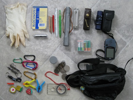 from my fanny bag and laid it out on the floor. The latest addition is a pair of latex gloves that I added after badly cutting my hand and not wanting to be digging around hunting caches and risk infection.